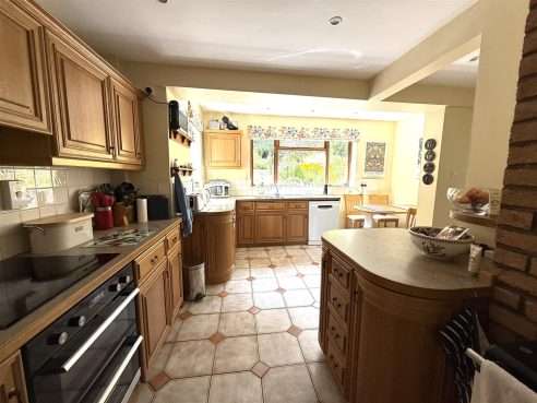 Having a comprehensive range of wall and base mounted units with work surfaces over, incorporating stainless steel sink with drainer and tiled splashback. Integrated electric oven with halogen hob and extractor hood over, space with plumbing for washing machine/ dishwasher, fridge and gas converted AGA. Inset ceiling lights, radiator, tiled flooring and window to rear aspect. Door to Inner Hallway.
