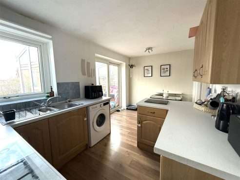 Being fitted with a range of wall and base mounted units with work surfaces over, incorporating inset stainless steel sink with mixer tap, drainer and tiled splash back. Built in electric oven with gas hob, space with plumbing for washing machine and useful under stairs storage. Ceiling light points, radiator and upvc double glazed window to rear aspect. Sliding upvc door to Lean to and Rear Garden and double doors to Lounge.