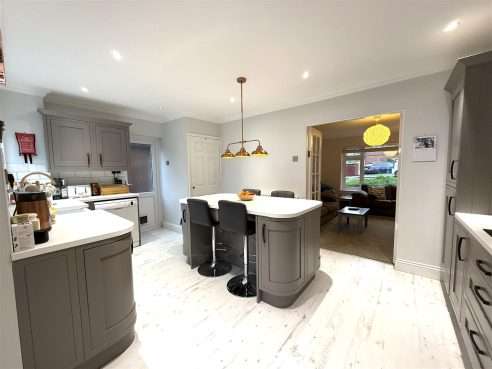 Being fitted with a range of wall and base mounted units with work surfaces over, incorporating enamel Belfast sink with mixer tap and tiled splash. Built in electric oven, induction hob with extractor over, integrated microwave, fridge/freezer, washing machine and space for dishwasher. Inset ceiling lights, coving, radiator, laminate flooring and storage cupboard housing combination boiler. A breakfast seating area with further units and over head lighting, upvc double glazed window to rear aspect and upvc door to side elevation. Open plan to Dining Room.