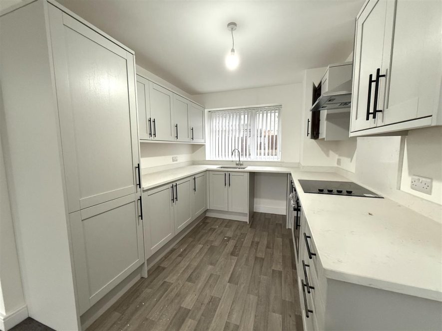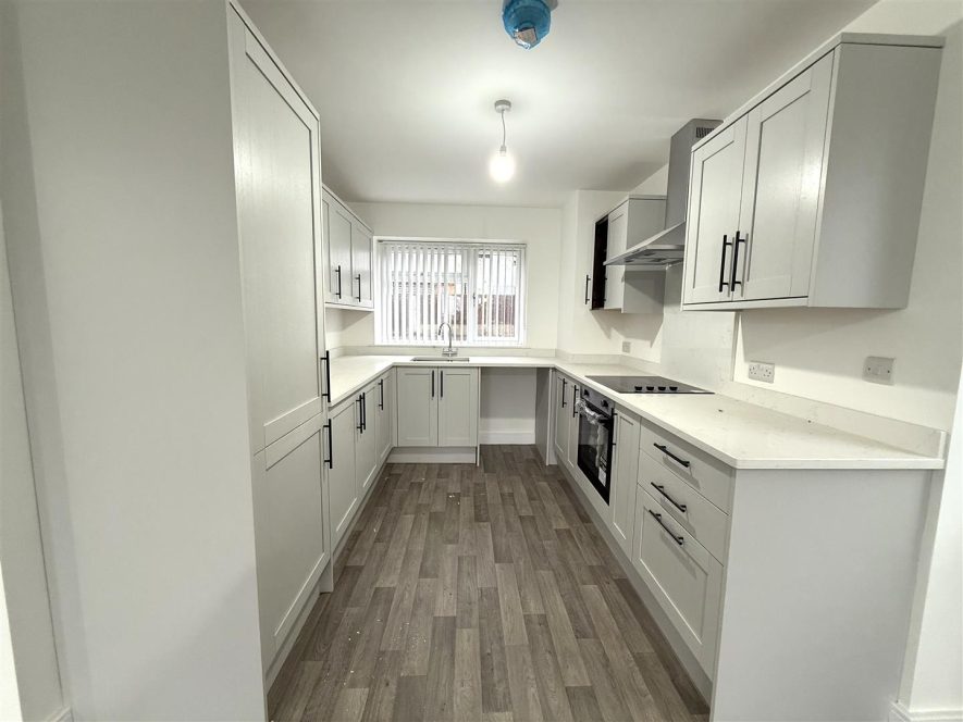 Being fitted with a range of wall and base mounted units with work surface over, incorporating inset sink with mixer tap and drainer. Built in electric oven, hob with extractor hood over, appliance space for washing machine and integrated fridge/ freezer. Ceiling light point and upvc double glazed window to front aspect.