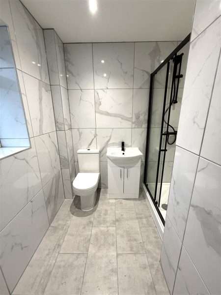 Comprising double walk in shower cubicle, vanity hand wash basin and w.c. Inset ceiling lights, tiling to wall sand flooring and upvc double glazed window to front aspect.