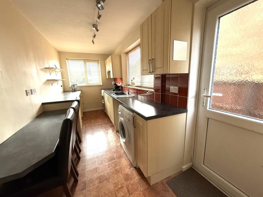 Being fitted with a range of wall and base mounted units with work surface over, incorporating inset stainless steel sink with mixer tap, drainer and tiled splash. Electric cooker with extractor over, washing machine and three further appliance spaces. Breakfast bar for seating, wall heater, larder storage cupboard, ceiling light point and upvc double glazed windows to rear and side aspects. Upvc double glazed door to side elevation leading to Rear Garden.