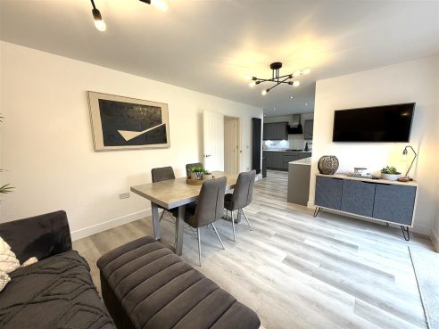 Approached from covered canopy with front entrance door and having ceiling light point, designer radiator, useful storage cupboard, LVT flooring and stairs leading to First Floor Landing.