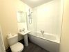 Comprising panelled bath with shower over and screen, pedestal hand wash basin and w.c. Ceiling light point, extractor fan, part tiling to walls and wall heater.