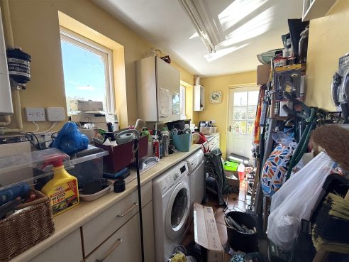 Again fitted with wall and base mounted units with work surfaces over. Space with plumbing for washing machine and further appliances. Ceiling light point, tiled flooring, wall mounted boiler and windows to side aspect. Hardwood door to rear elevation.