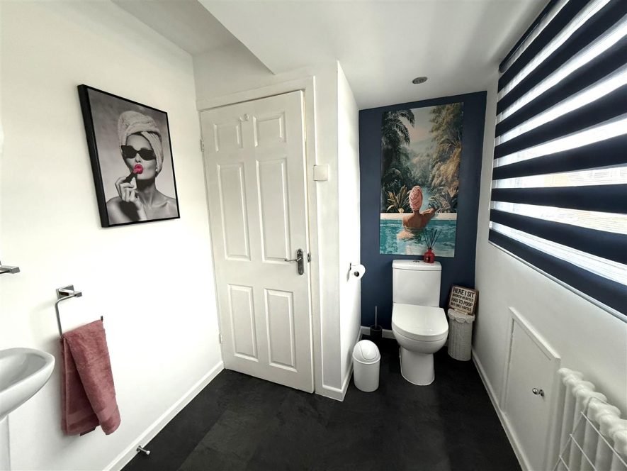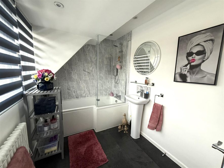 Comprising shaped bath with shower over and screen, pedestal hand wash basin and w.c. Inset ceiling lights, radiator, tiling to walls and flooring and upvc double glazed window to rear aspect.