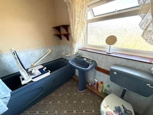 Comprising panelled bath with shower over, w.c and pedestal hand wash basin. Ceiling light point, radiator, part tiling to walls and upvc double glazed window to rear aspect.