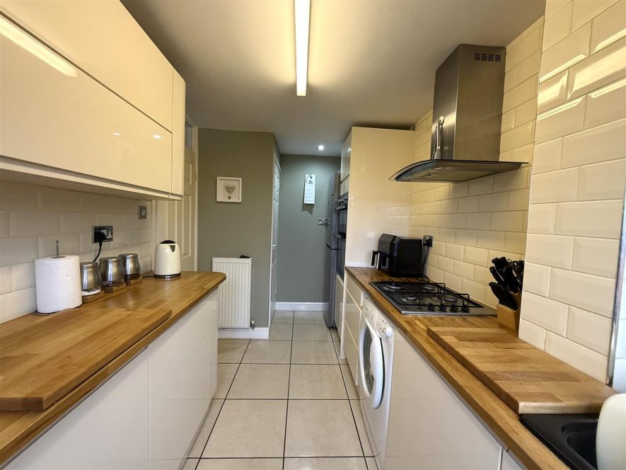 Being fitted with a range of cream gloss wall and base mounted units with oak work surfaces over, incorporating inset stainless steel sink with telescopic tap, drainer and tiled splash. Built in double electric oven, gas hob with extractor over and spaces for further appliances. Ceiling light point, radiator, tiled flooring, useful storage cupboard and upvc double glazed window to rear aspect. Upvc door to Rear Garden.