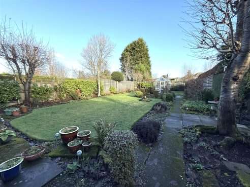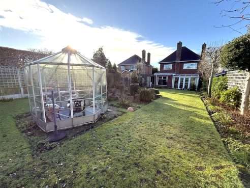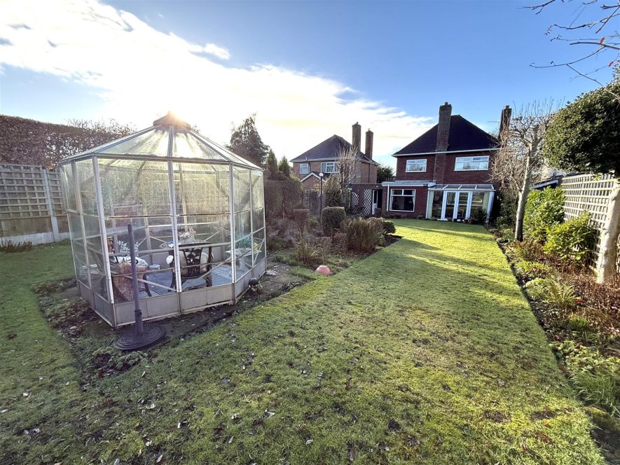 A driveway providing plentiful parking to Garage ( 33'10" x 9'3") with up and over door having light, power and access door to Rear Garden. The well maintained enclosed rear garden having pathway to lawn with mature planted borders, greenhouse, outside tap and paved seating area.