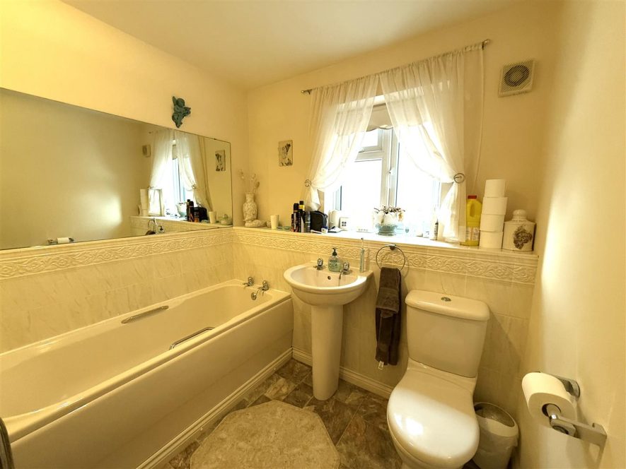 Comprising panelled bath, pedestal hand wash basin and w.c. Ceiling light point, radiator, part tiling to walls, extractor fan and upvc double glazed window to side aspect.