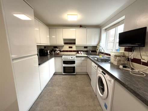 Being fitted with a range of wall and base mounted units with work surfaces over, incorporating inset stainless steel sink with mixer tap, drainer and tiled splash. Gas cooker with extractor over, integrated fridge/freezer and spaces for washing machine and dishwasher. Two ceiling light points, radiator and upvc double glazed window to rear aspect. Upvc door to Porch allowing access to the enclosed Rear garden.