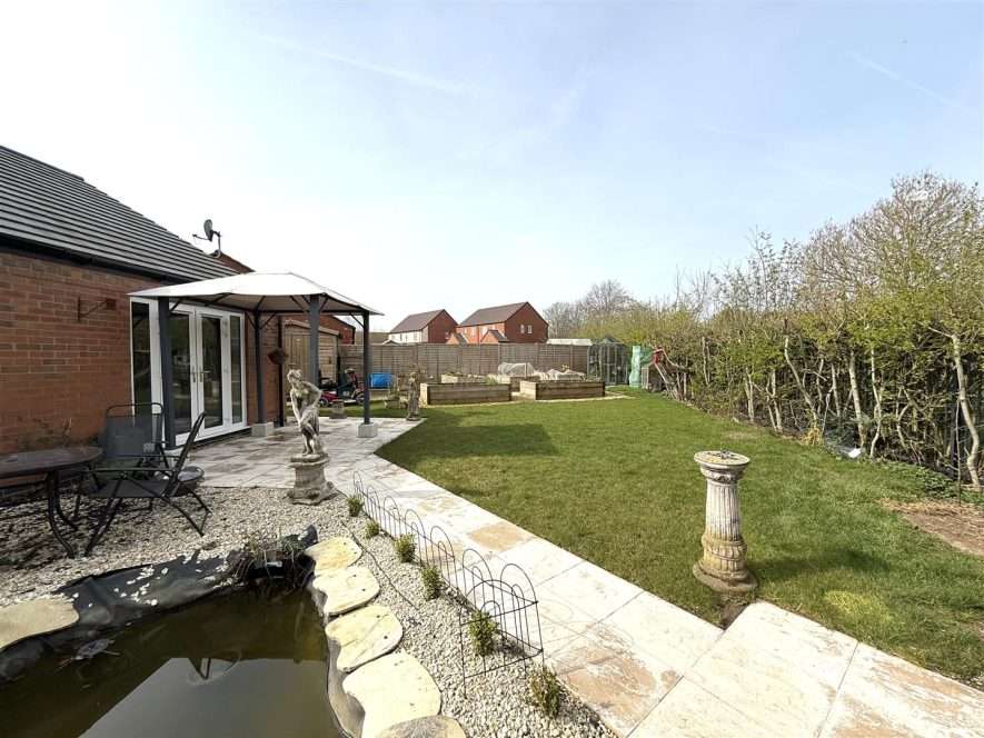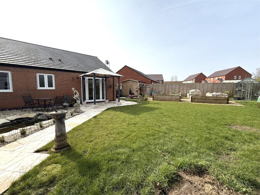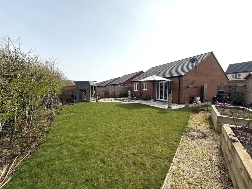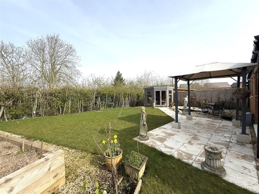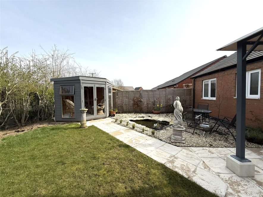 The front of the property having a lawned fore garden with planted borders and pathway to front entrance door. A driveway provides off road parking and gate allowing access to the good sized enclosed rear garden. This having paved patio, lawn with borders, a gravelled seating area with built in fish pond, raised planters for vegetable growing, greenhouse, summer house and shed. Outside tap.
