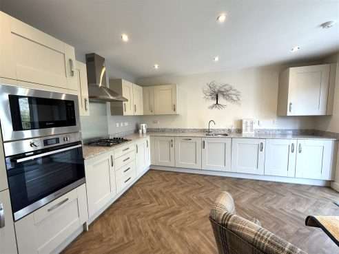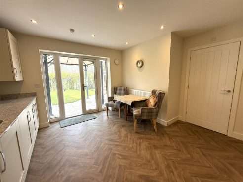 Being fitted with a comprehensive range of wall and base mounted units with granite work surface, incorporating inset sink with mixer tap and drainer. Built in electric oven, gas hob with extractor hood over, integrated dishwasher, washing machine, microwave and fridge/freezer. Inset ceiling lights, radiator, wall mounted combination boiler and French upvc doors leading to the Rear Garden