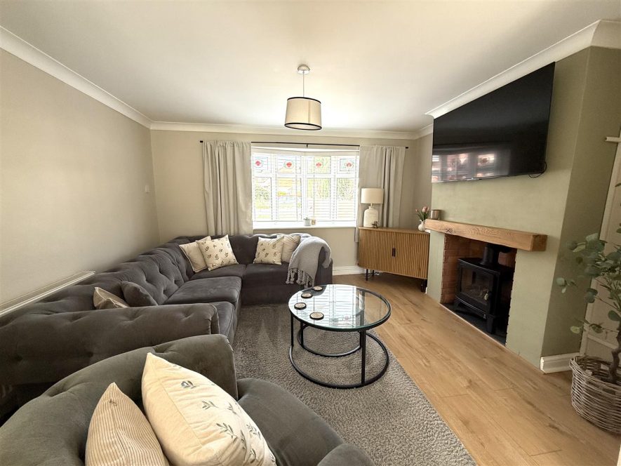 Having wooden mantle over electric effect log burner on tiled hearth. Ceiling light point, coving, radiator and laminate flooring. Upvc double glazed window to front aspect.