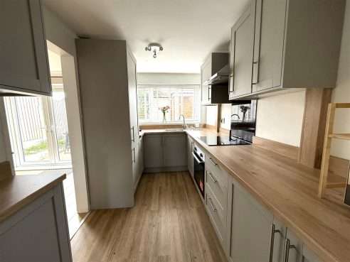 Being fitted with a range of wall and base mounted units with work surfaces over, incorporating inset stainless steel sink with mixer tap and drainer. Built in electric oven with hob and extractor hood over. Integrated fridge/ freezer and washing machine. Ceiling light point, laminate flooring, and upvc double glazed window to rear aspect. Arch to Dining Room.