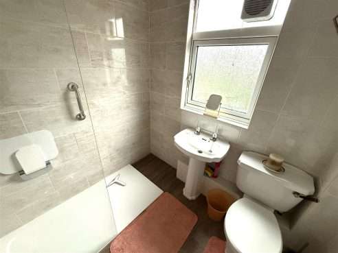 Comprising walk in shower, pedestal hand wash basin and w.c. Ceiling light point, radiator, tiling to walls, laminate flooring and upvc double glazed window to side aspect.