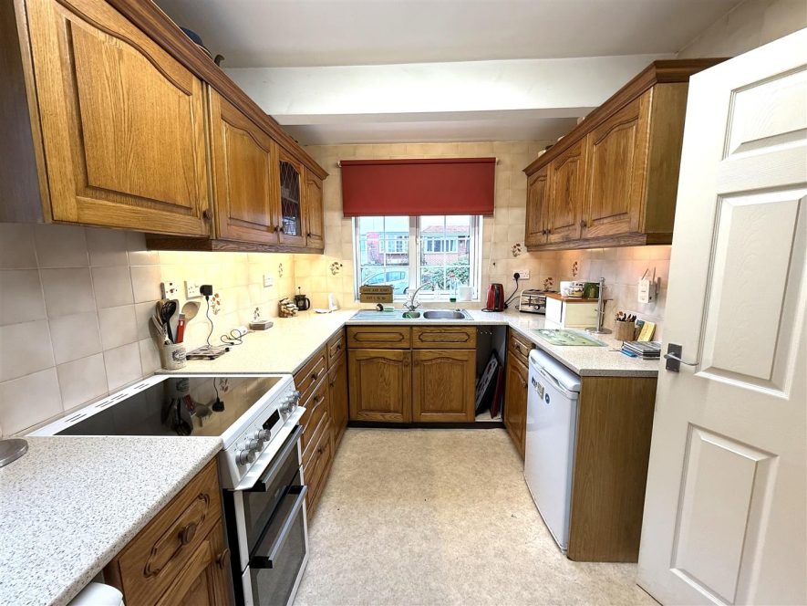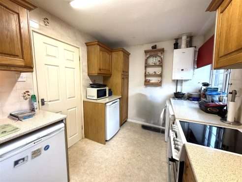 Being fitted with a range of wall and base mounted units with work surfaces over, incorporating inset stainless steel sink with mixer tap, drainer and tiled splash. Electric cooker with extractor fan over, washing machine, fridge, freezer and dishwasher. Ceiling light point, wall mounted boiler and upvc double glazed windows to front and side aspects.