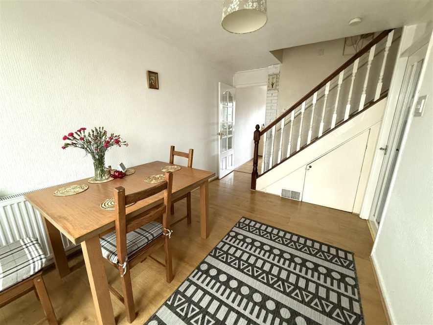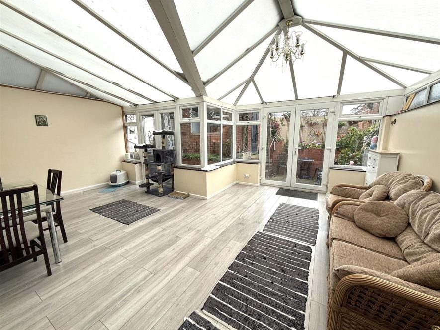 Having ceiling light point, coving, laminate flooring, radiator and under stairs storage cupboard. Stairs to First Floor Landing, Upvc double glazed French doors to Conservatory and further door to Kitchen.