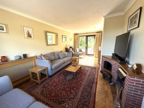 Having a feature brick fireplace with inset electric fire on a tiled hearth. Inset lights, coving, two radiators, oak wood block flooring and bay window to front aspect. Sliding patio double glazed door leading onto the landscaped Rear Garden. Door to Fitted Kitchen.