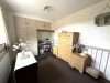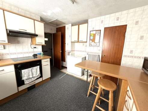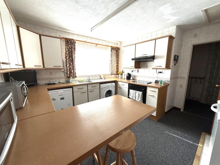 Being fitted with a range of wall and base mounted units with work surfaces over, incorporating inset stainless steel sink with mixer tap, drainer and tiled splash. Built in electric oven with hob and extractor over, space with plumbing for washing machine and two further appliance spaces. Ceiling light point, radiator, breakfast bar seating area, useful pantry cupboard with shelving and further cupboard housing combination boiler. Upvc double glazed window to front aspect.
