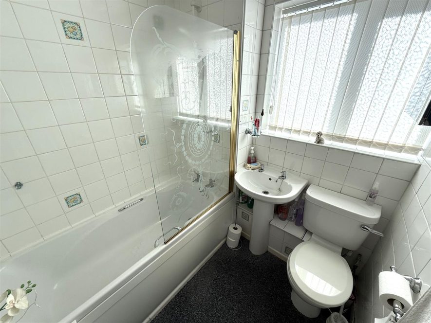 Comprising panelled bath with shower over and screen, pedestal hand wash basin and w.c. Ceiling light point, tiling to walls, radiator and upvc double glazed window to front aspect.