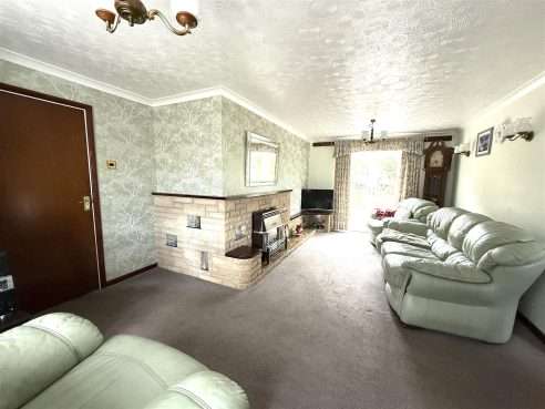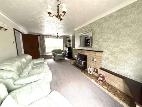 Having a brick feature fireplace with gas fire on tiled hearth. Two ceiling light points, coving, radiator and upvc double glazed bow window to front aspect. French upvc double glazed doors leading to Rear Garden. Door to Kitchen.