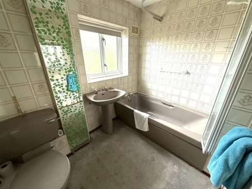 Comprising panelled bath with shower over and screen, pedestal hand wash basin and w.c. Ceiling light point, tiling to walls, radiator and upvc double glazed window to front aspect.